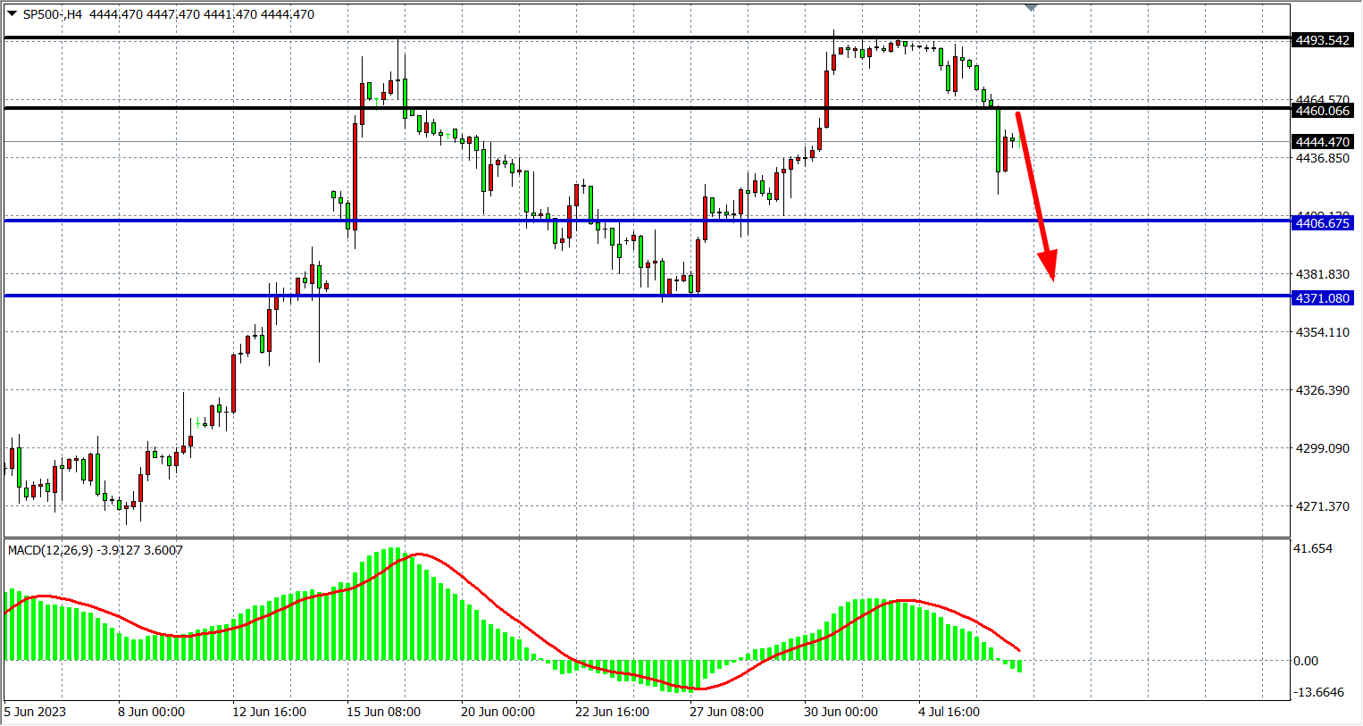 4小时图看,标普进一步跌破4460,MACD量能下穿零轴,趋势继续走回调,上方阻力4460-4490,下方支撑4400-4370。