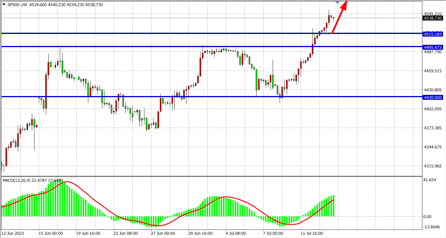 4小时图看,标普在4495之上进一步走高,MACD量能在零轴上持续放量,趋势延续上涨,当前支撑上移至4495-4415,上方阻力4580-4630。
