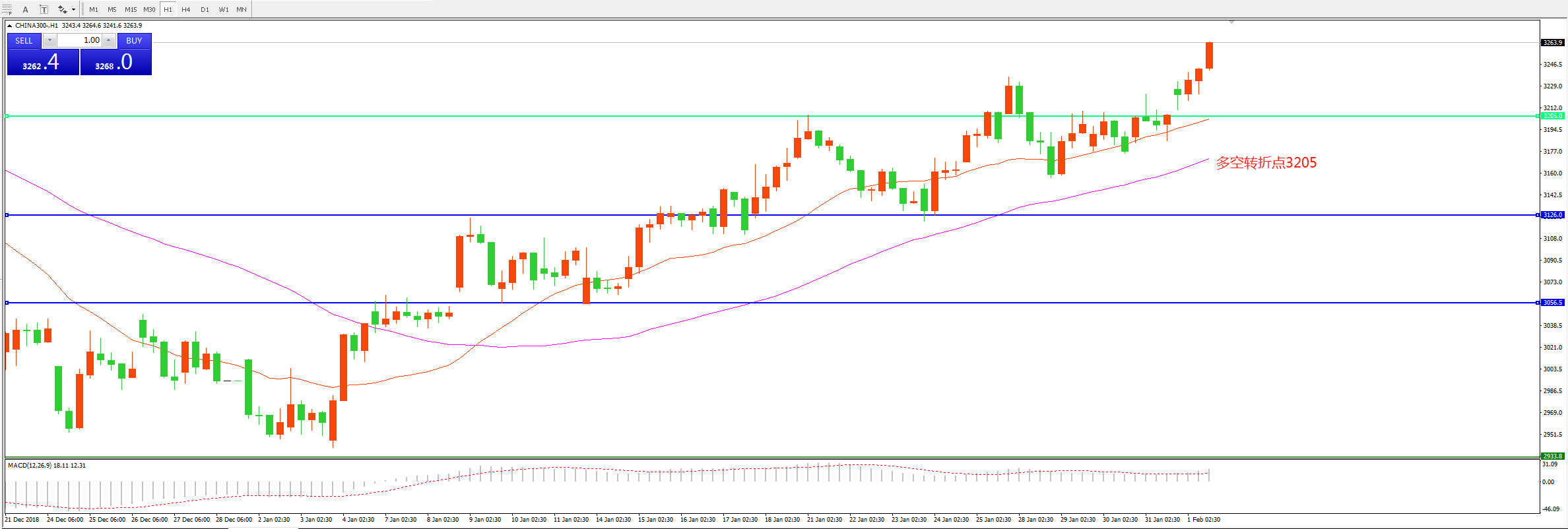 小时图看,CHINA300中华指数均线系统呈多头排列,整体走势十分强势。 MACD红柱增加,保持偏多思路。